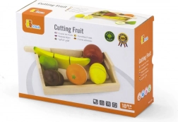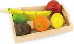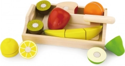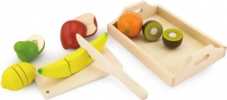 Ovocie a nôž sú vyrobené z prírodného dreva, čo zaisťuje bezpečnosť a odolnosť pri hre.