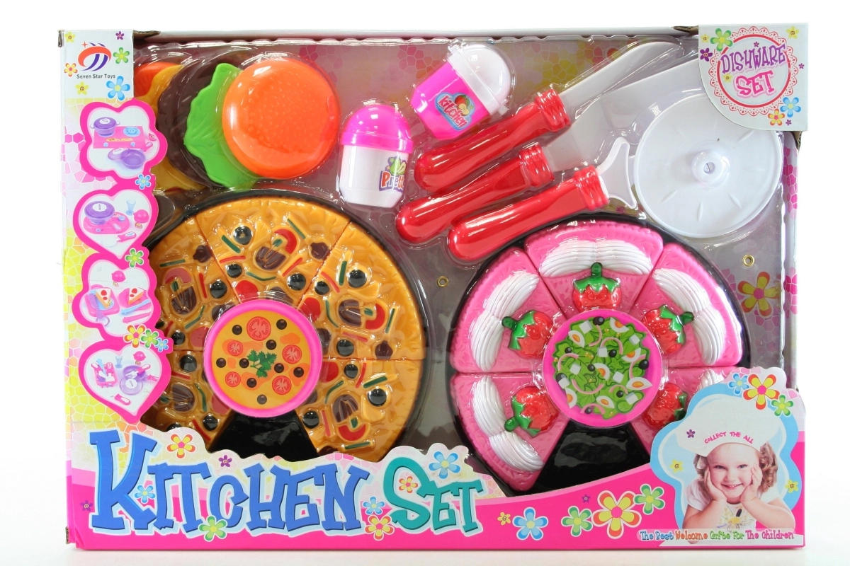 Zábavná plastová sada pre malých kuchárov obsahuje koláč a tortu krájanú na dieliky, hamburger, soľničku, koreničku a kuchynské náradie. Ideálna na hru na varenie a rozvoj motoriky. Bezpečné plastové prevedenie, realistické doplnky a ľahké krájanie na dieliky poteší deti od 3 rokov.