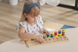 Táto drevená hračka nie je len zábavou, ale aj skvelým vzdelávacím nástrojom. Deti si môžu hrať s očíslovanými dlaždicami a farebnými krúžkami, ktoré podporujú vizuálne a hmatové učebné zručnosti.