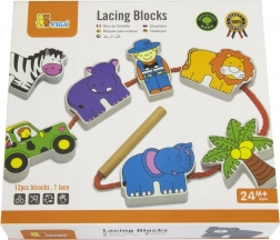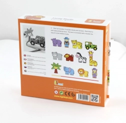 Sada obsahuje drevené kocky, ktoré zobrazujú obyvateľov safari vrátane leoparda, palmy, opice, hrocha, zebry, džípu, žirafy, medveďa, leva, slona a sprievodcu. Kocky sú precízne maľované z oboch strán netoxickými farbami a prinášajú deťom veľa radosti pri hraní. Všetky prvky sú navrhnuté tak, aby podporovali rozvoj jemnej motoriky a znalosti zvieracieho sveta.