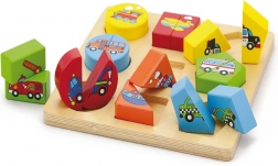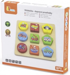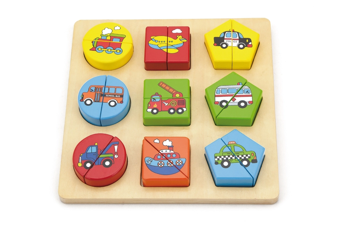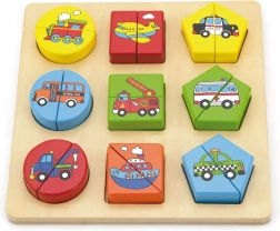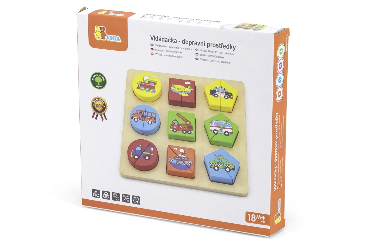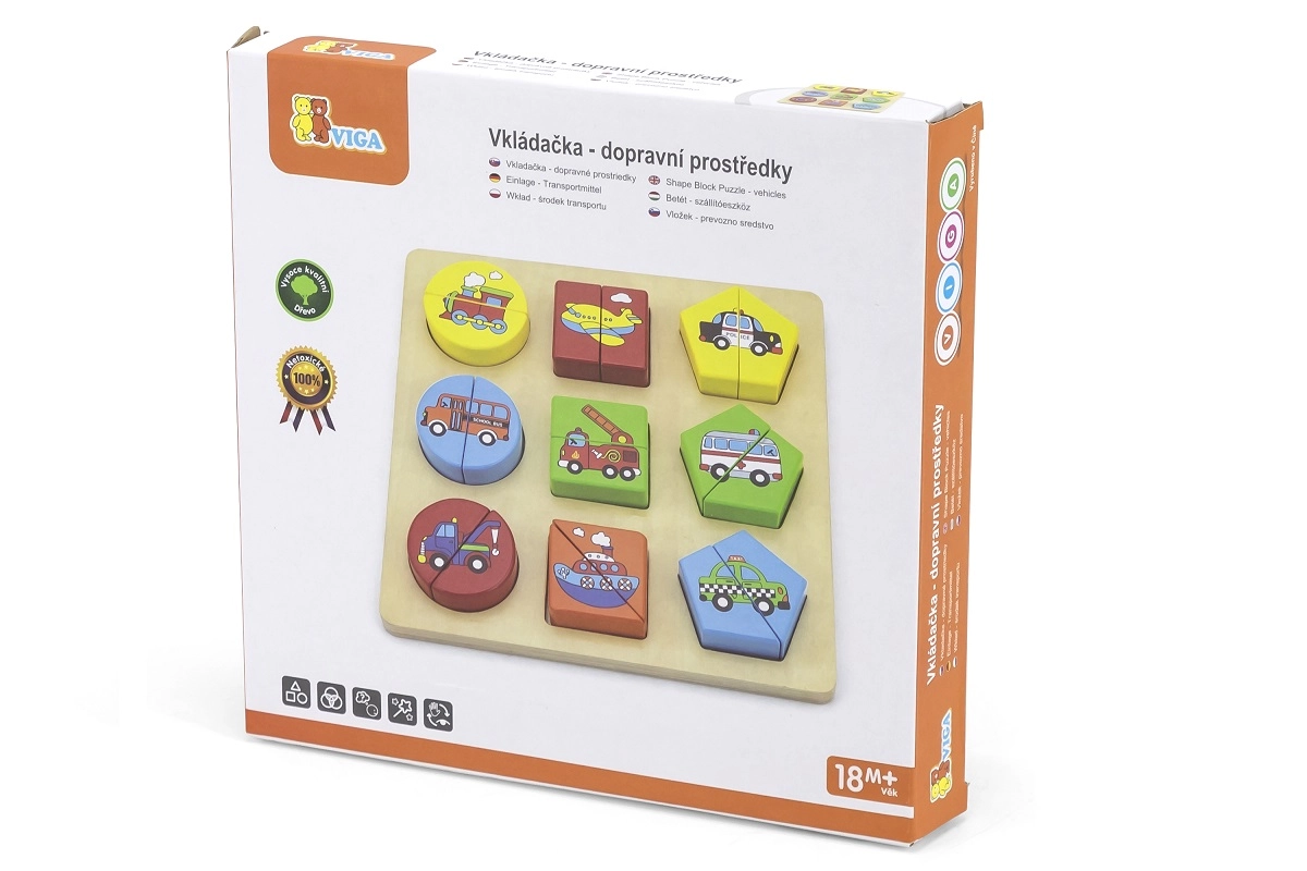 Drevené puzzle pre najmenších v českej krabici. Obsahuje 18 dielikov, z ktorých možno poskladať 9 obrázkov. Rozmery jedného dielika cca 4,5 × 2,5 cm. Rozmery balenia cca 20,5 × 21 × 3 cm. Vek 18m+