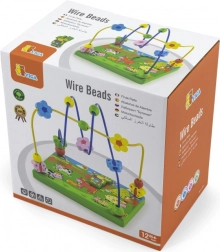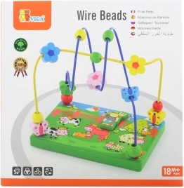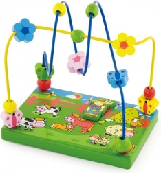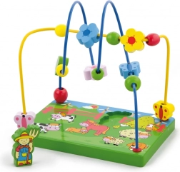 Herný labyrint s korálkami na vodičoch rozvíja jemnú motoriku, koordinačné schopnosti a logické myslenie. Pevná drevená základňa s motívom farmy a magnetická figúrka farmára podnecujú kreatívnu hru a objavovanie. Ideálne od 18 mesiacov.