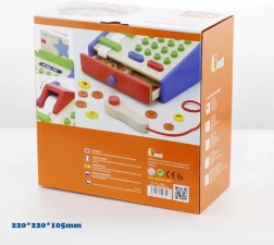 Pokladňa je vyrobená prevažne z dreva a doplnená odolnými plastovými prvkami. Ideálna na hru na obchod doma aj v škôlke, kde prirodzene rozvíja logické myslenie, poznávacie zručnosti a vzťah k číslam v duchu Montessori.