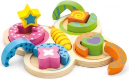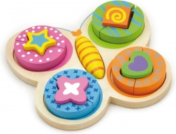 Rozkošné drevené puzzle v tvare motýlika prináša deťom od 2 rokov hodiny zábavy aj učenia. Vďaka jasným farbám, veľkým bezpečným dielikom a vyfrézovaným okrajom diely skvele držia na mieste. Hračka podporuje jemnú motoriku, koordináciu oko–ruka a tvorivosť.