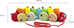 Táto veselá drevená húsenica je ideálna hračka pre batoľatá. Pestrofarebné segmenty sa pri jazde pohybujú a rotujú, čo deti motivuje k chôdzi aj aktívnej hre. Pevná konštrukcia a hladké hrany zabezpečujú bezpečné používanie v detských rúčkach.