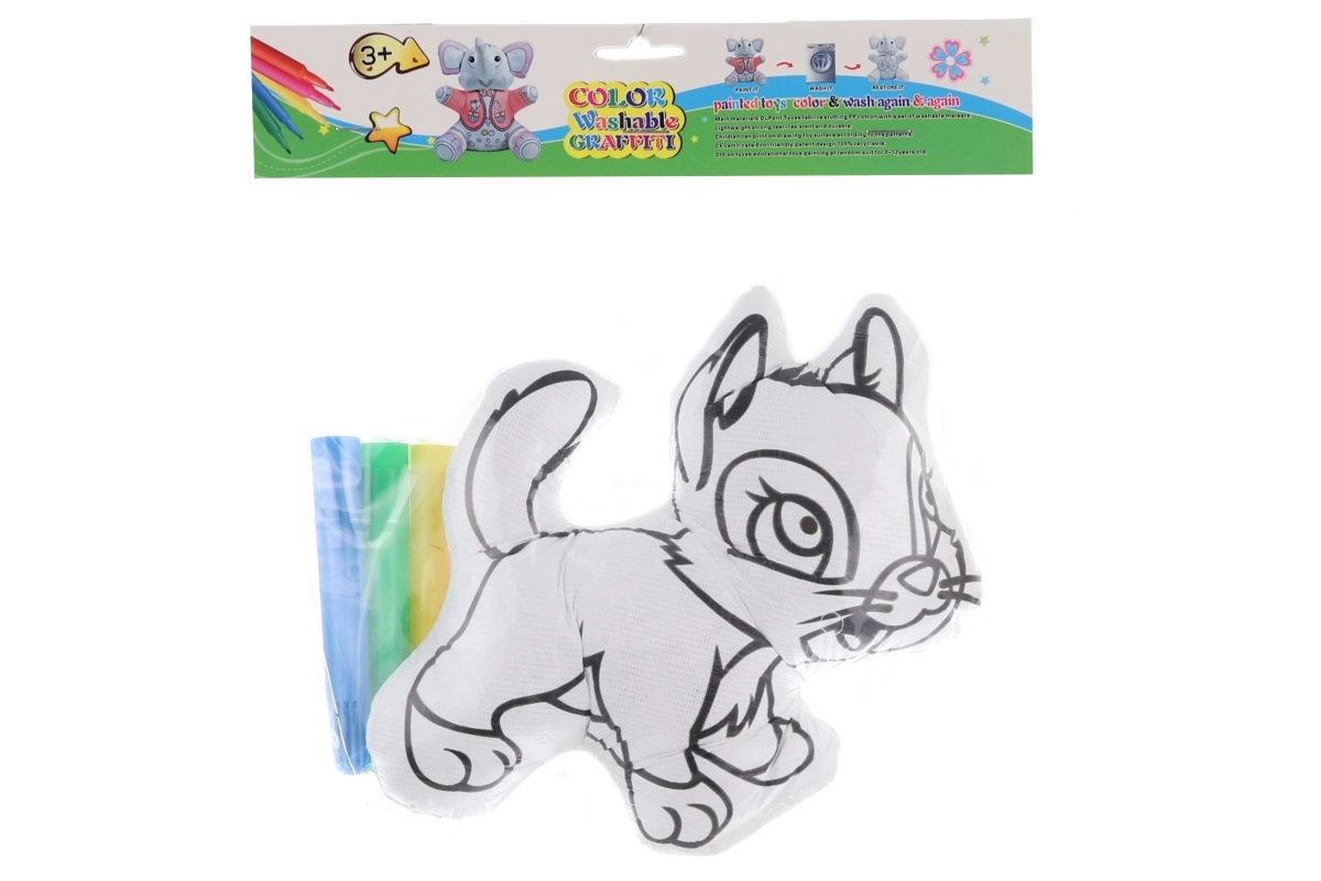 Zábavná kreatívna hračka pre deti: maľovacia mačka, ktorú môžu deti vyfarbiť, oprať a znova si ju vyzdobiť podľa fantázie. Súčasťou balenia sú 4 farebné fixky. Plyšové zvieratko s rozmerom cca 16 × 16 cm je vyrobené z polyestru a je ideálne pre deti od 3 rokov.