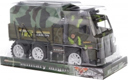 Realistické vojenské auto s plachtou s dĺžkou cca 23 cm nadchne malých milovníkov techniky. Plachta je upevnená pomocou gumičiek a možno ju ľahko zložiť. Auto sa pohybuje na zotrvačník pre zábavnú jazdu bez batérií. Ideálna hračka pre deti od 3 rokov.