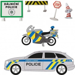 Realistická súprava diaľničnej polície v českom dizajne zo série City Collection poteší všetkých malých ochrancov zákona. Obsahuje kovové policajné auto so svetelným a zvukovým majákom, plastovú motorku a dopravné značky. Vďaka pohonu na spätné natiahnutie je akcia na ceste hneď v plnom prúde. Ideálne pre deti od 3 rokov.