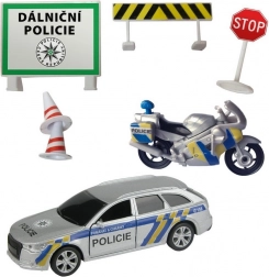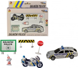 Táto súprava prináša autentický zážitok z práce diaľničnej polície, ako ju poznáte z našich ciest. Kovové policajné auto so svetelnými a zvukovými efektmi a plastová motorka spolu s dopravnými značkami podporujú kreatívnu hru a rozvoj fantázie. Vďaka spätnému natiahnutiu sa vozidlá rýchlo rozbehnú a zábava môže začať.