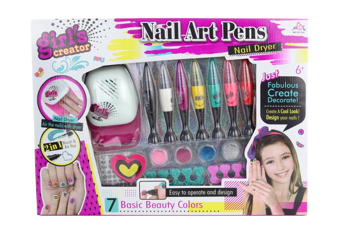 Vytvorte si doma nechtové umelecké dielo s kompletnou kreatívnou sadou pre malé stylistky. Set obsahuje 7 farebných lakov s obojstranným aplikátorom (štetček a pero), sušičku na nechty na 2× AAA batérie, pilníček, oddeľovače prstov, trblietavé prášky a farebné nálepky. Ideálne pre deti od 6 rokov.
