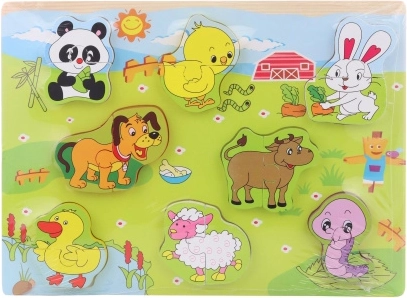 Táto kvalitná drevená vkladačka prináša deťom radosť z objavovania a učenia. Farebné dieliky s motívmi domácich zvierat pomáhajú rozvíjať koordináciu oko–ruka a trpezlivosť, zároveň učia spoznávať tvary a zvieratká.