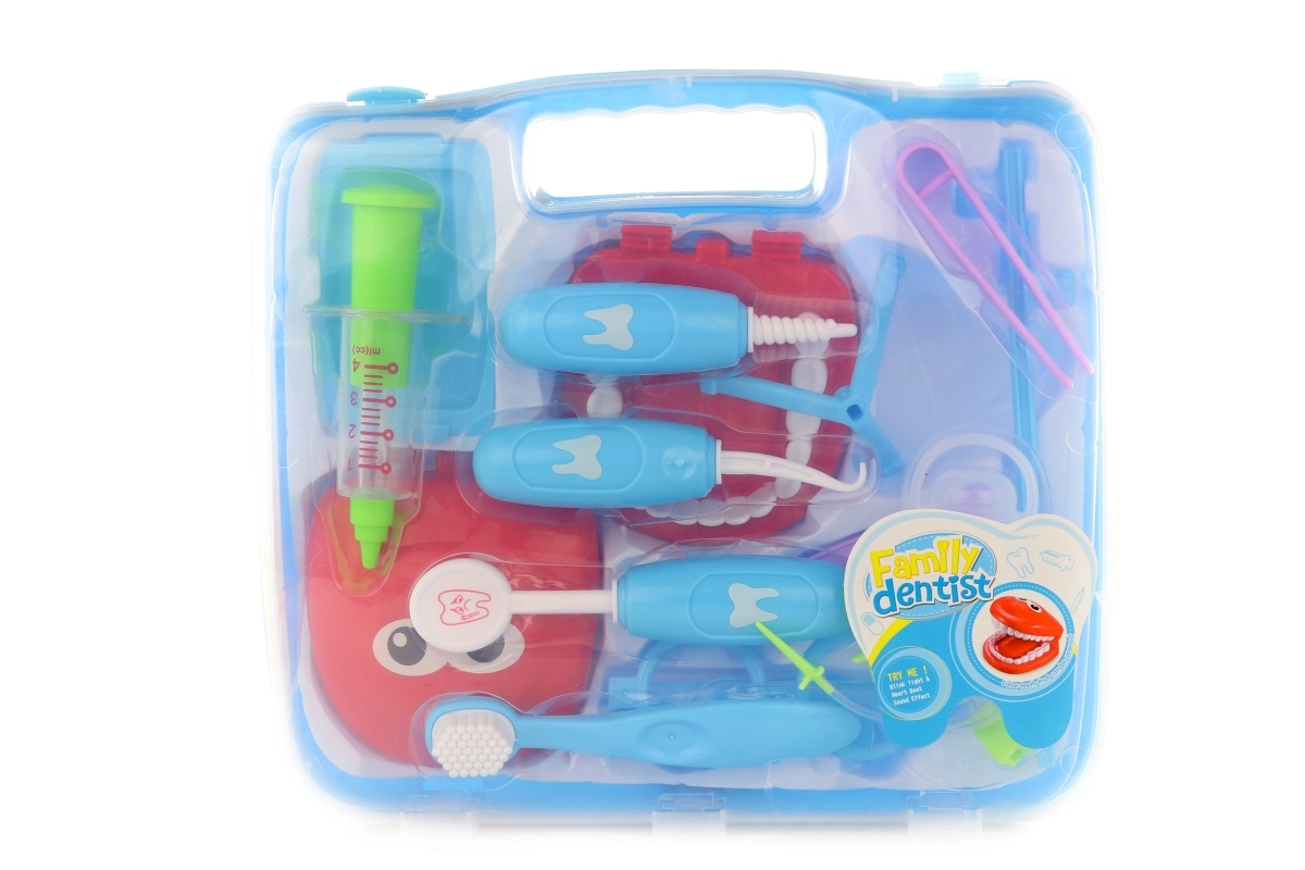 Otvárací model zubov, injekcia, kefka, pinzeta, „vŕtačka“, zrkadielko a ďalšie doplnky