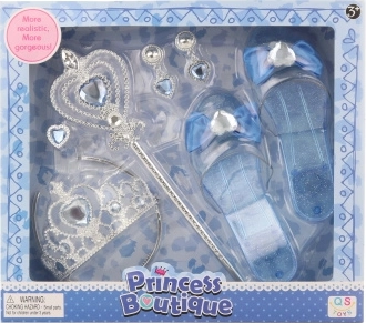 Rozžiarte detskú fantáziu elegantnou sadou doplnkov pre princeznú, ktorá obsahuje všetko na kráľovské prezliekanie: črievičky, korunku, žezlo, prsteň a náušnice. Ideálne na detské hry, karneval aj prezliekanie doma.