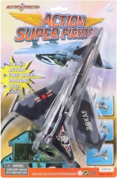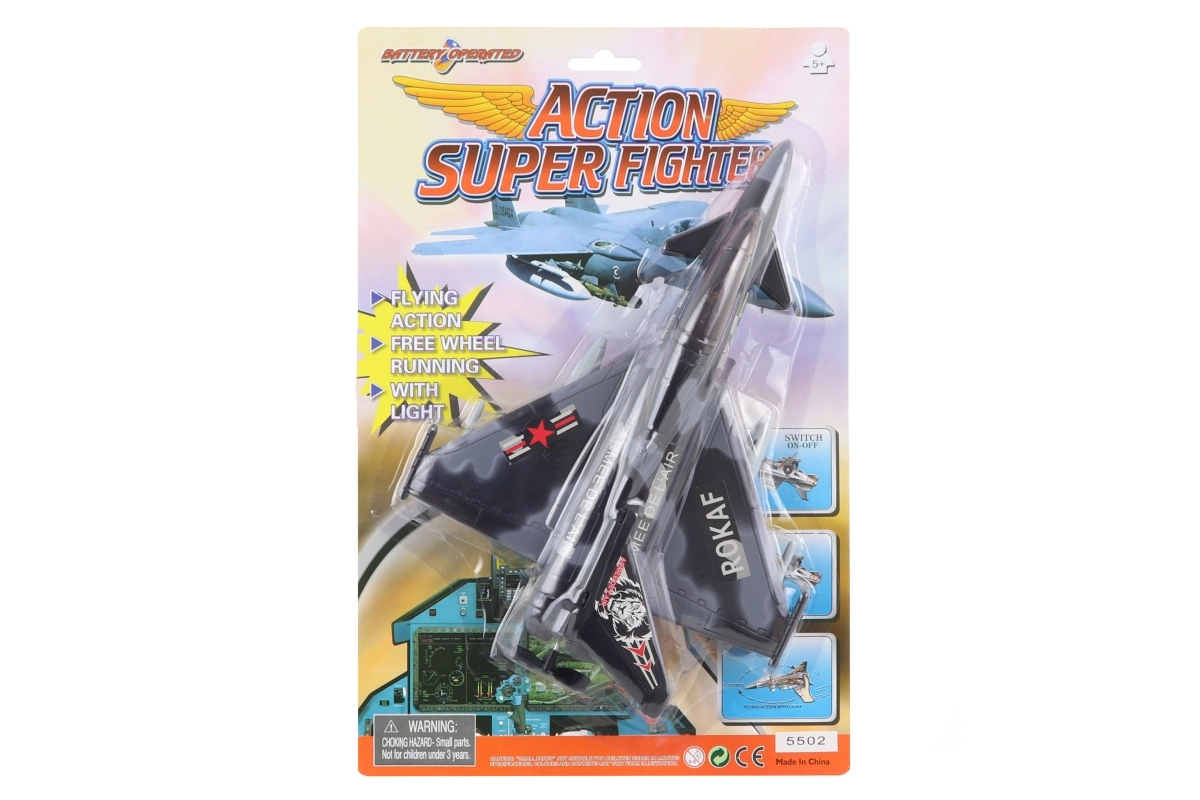 Zábavná plastová stíhačka pre deti od 5 rokov prináša veľa akcie doma aj na záhrade. Po zavesení na priložené lano sa automaticky otáča dookola, po zapnutí svieti a roztočí vrtuľku pre realistický efekt letu. Napájanie zabezpečujú 2× AA batérie (nie sú súčasťou). Kompaktné rozmery hračky cca 28 × 21 cm.