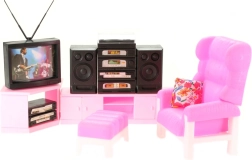 - Plastové kreslo, podnožka, obývacia stena s dvierkami, rohová skrinka, televízor s anténou, video, hi-fi súprava s reproduktormi
