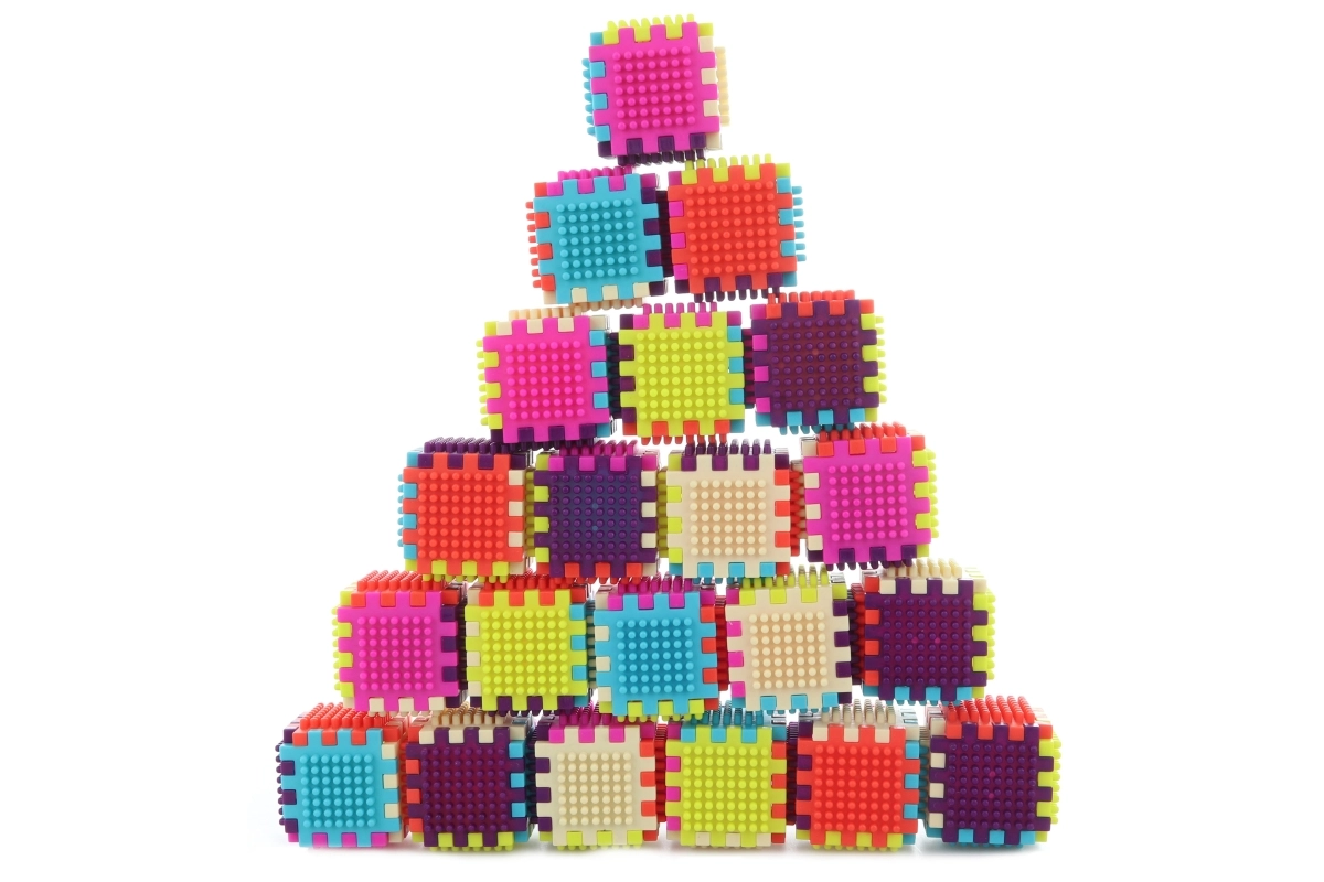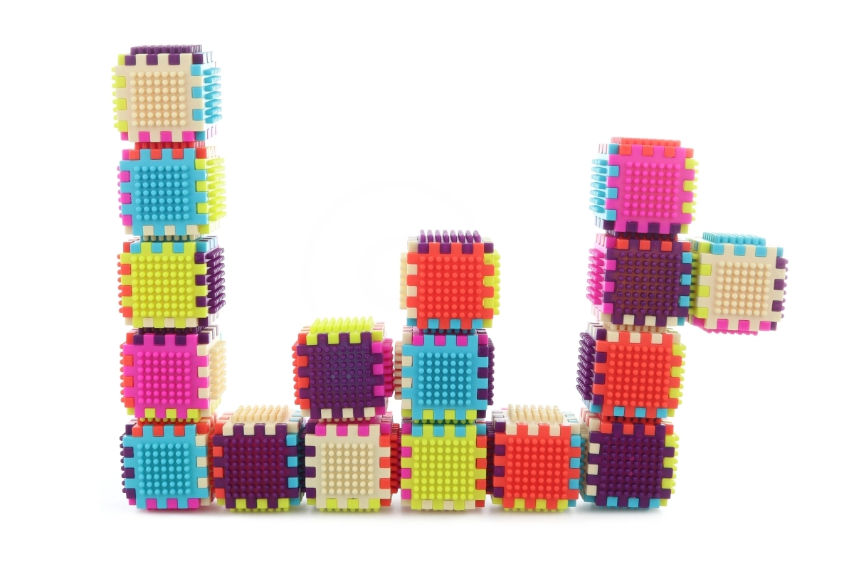 Pestré farby a ľahko spojiteľné kocky inšpirujú deti k tvorbe veží, domčekov aj fantastických objektov.