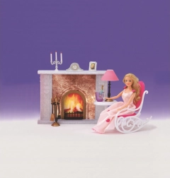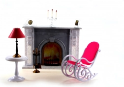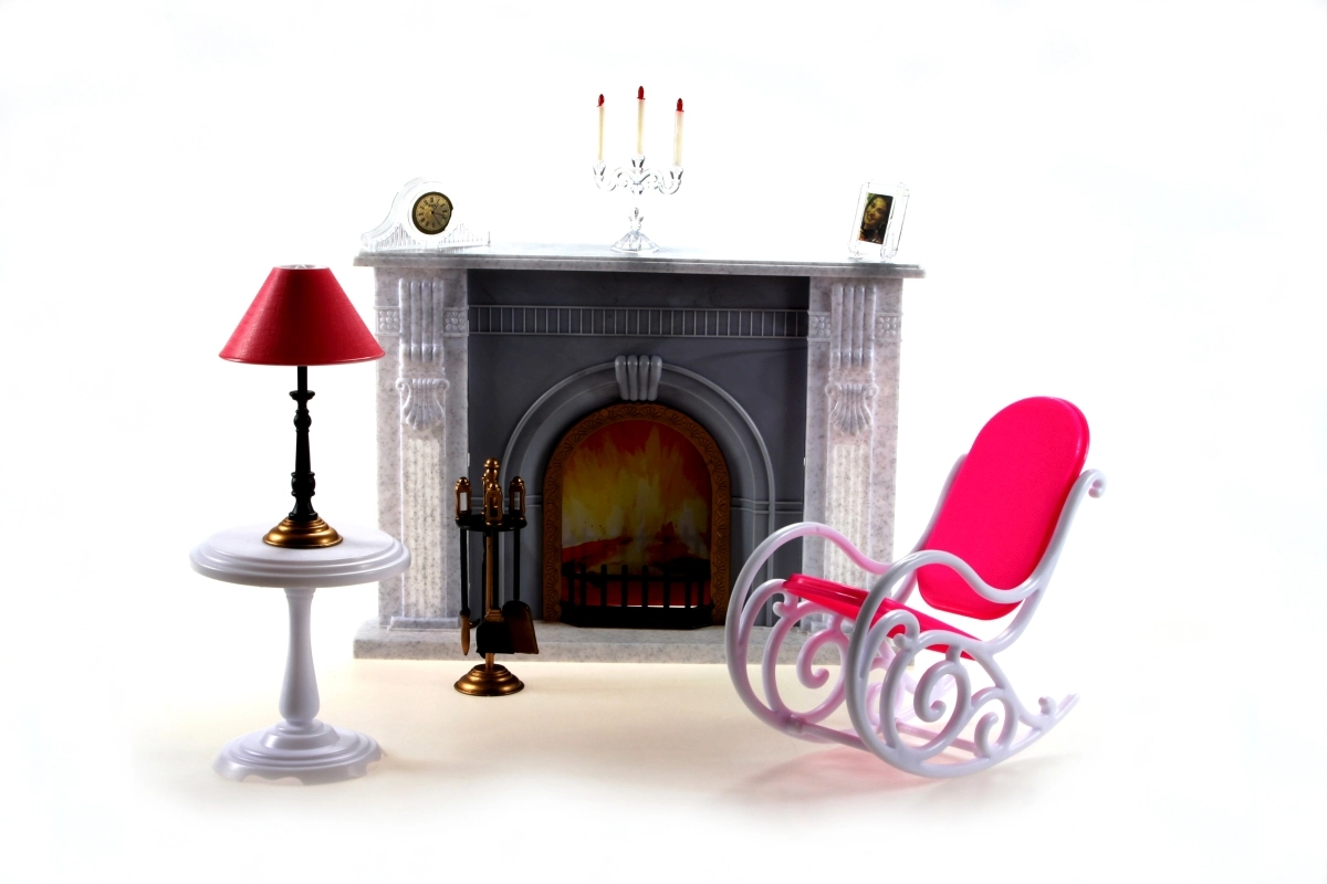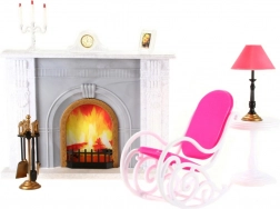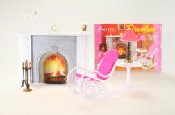 - Plastový krb, svietnik, obrázok, hodiny, hojdacie kreslo, stolček s lampou, stojan s krbovým náradím