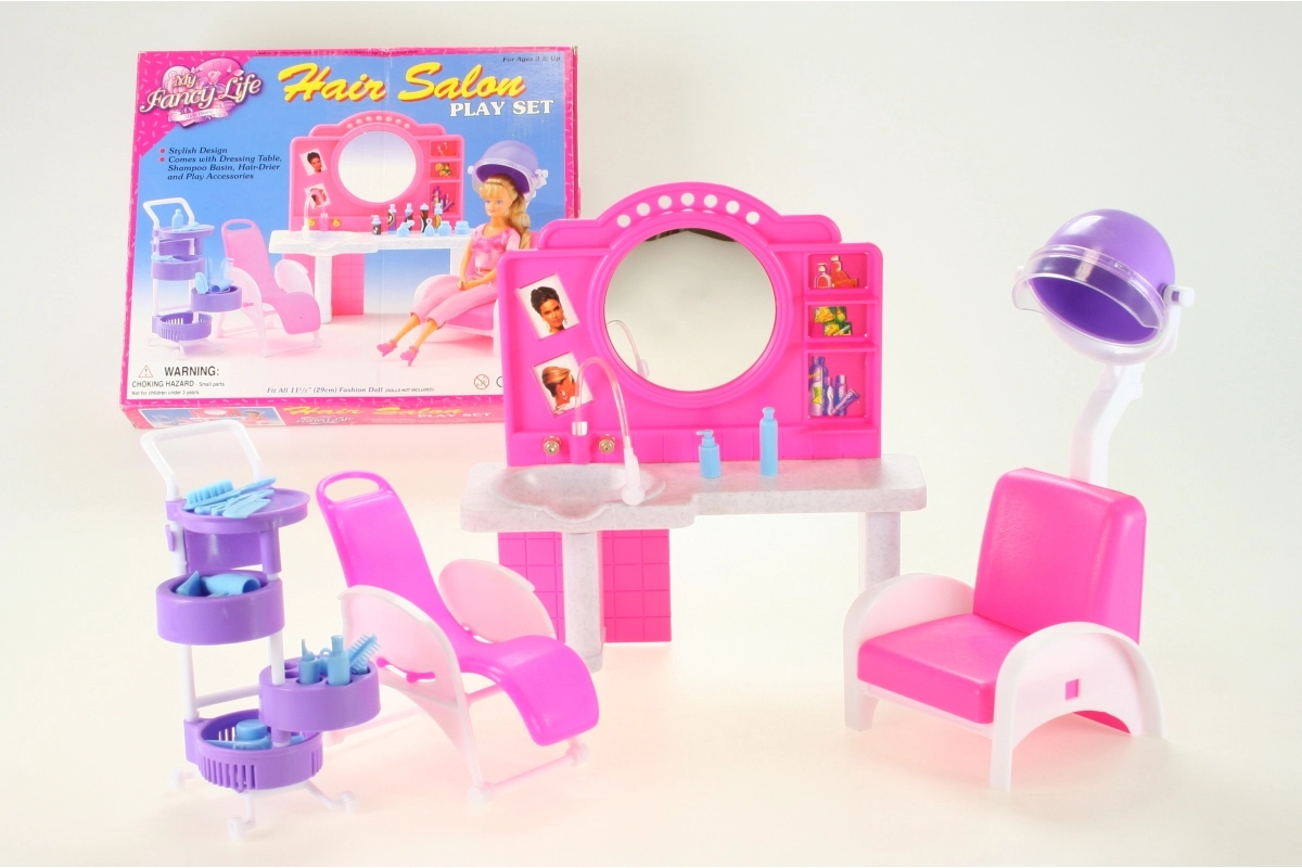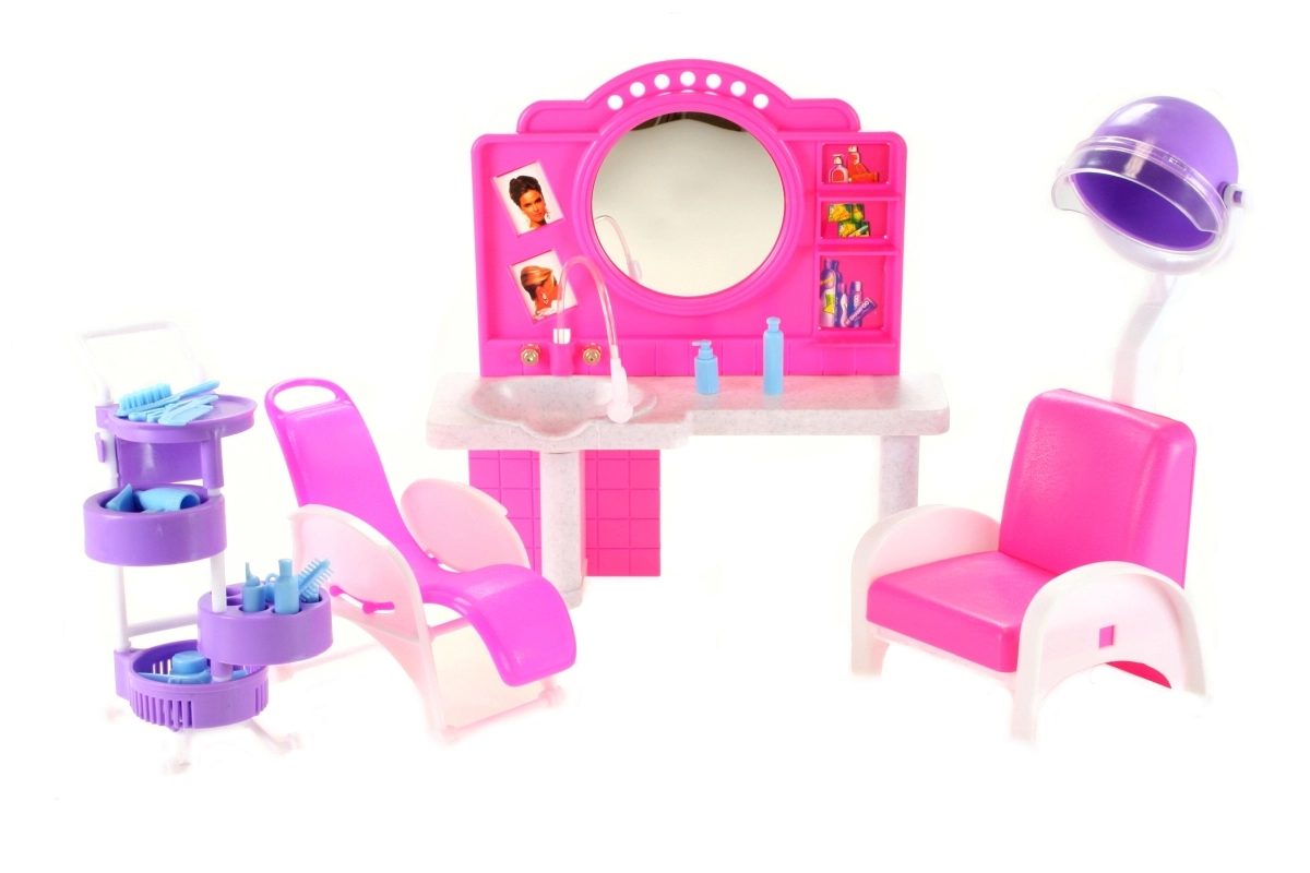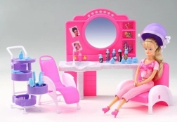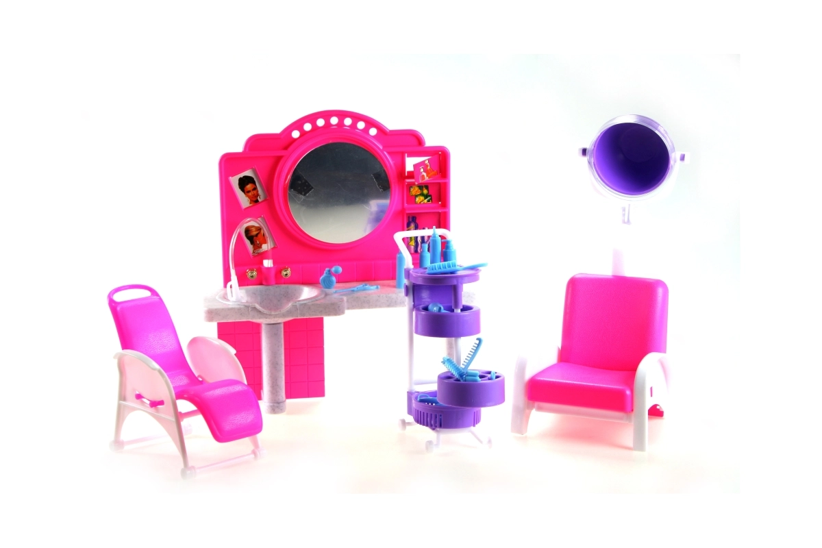 Štýlový herný set Glorie kadernícky salón prinesie deťom veľa zábavy pri hre na kaderníctvo. Obsahuje toaletný stolík so zrkadlom a umývadlom, pohodlné kadernícke kreslá, vozík s priehradkami a radu doplnkov na úpravu vlasov, ako sú hrebienky, kefy a fľaštičky. Vyrobené z odolného plastu. Bábika nie je súčasťou balenia. Vhodné pre deti od 3 rokov.