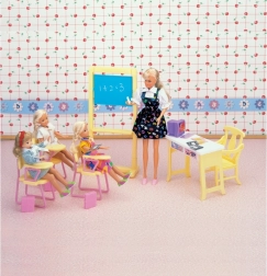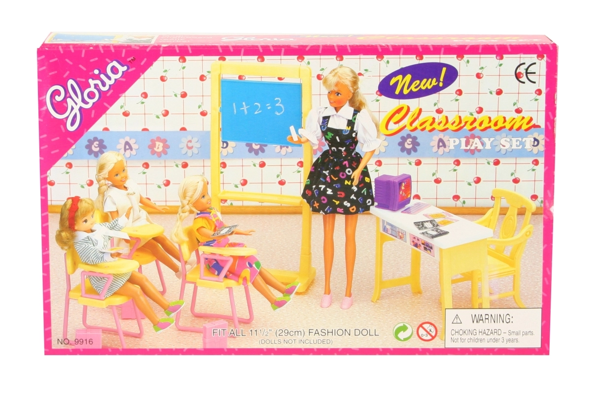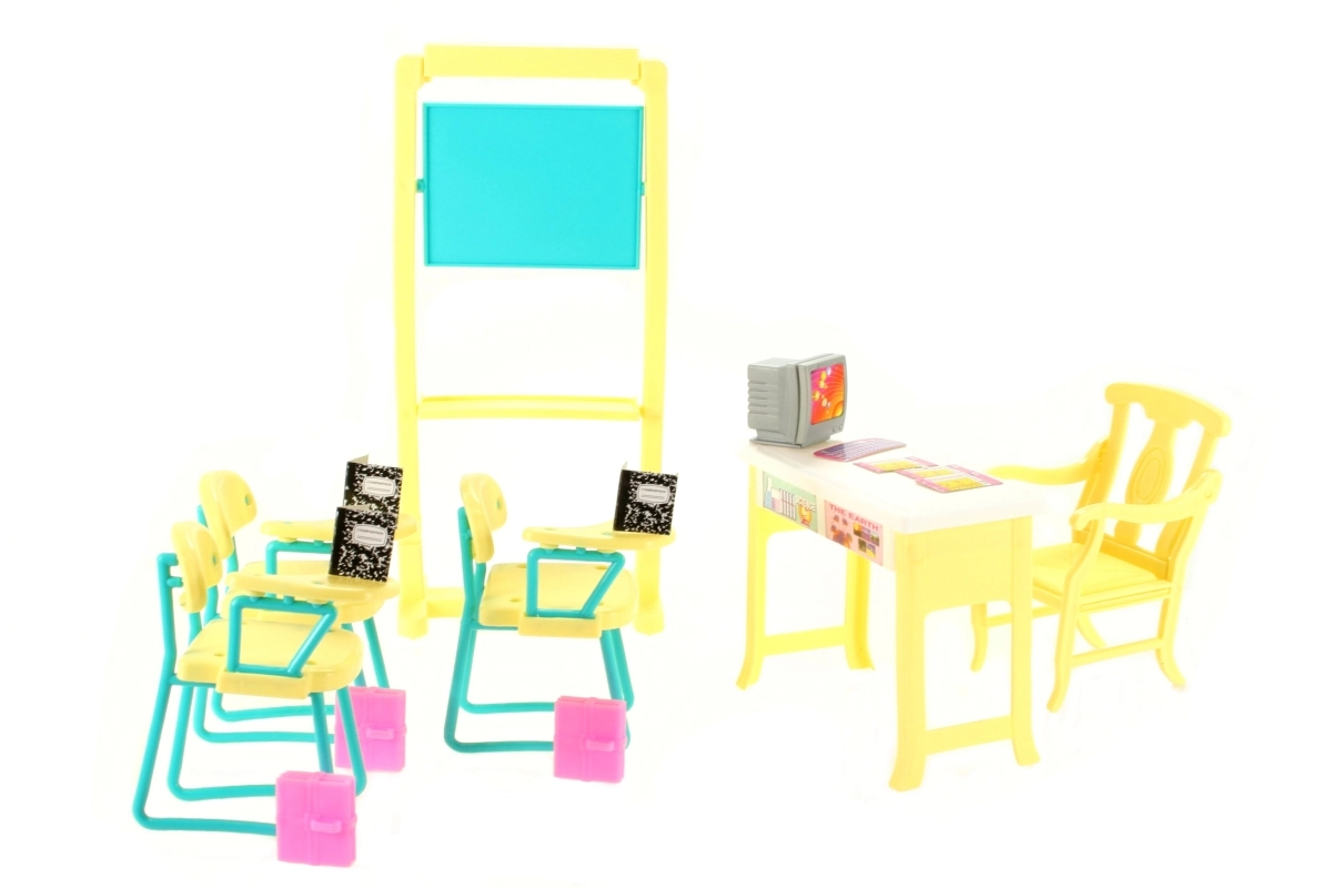 Súčasťou balenia je priestranná tabuľa, učiteľský kútik s počítačom a stoličky pre žiakov. Vďaka kompaktným rozmerom je set kompatibilný s bežnými bábikami a ľahko sa ukladá.