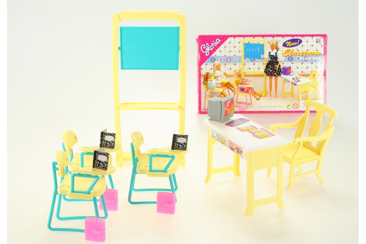 Vytvorte doma vlastnú školskú atmosféru so sadou Glorie školská trieda. Tento bohato vybavený set ponúka tabuľu, učiteľský stôl a stoličku, 3 stoličky s opierkami, počítač s klávesnicou, tašky a papierové zošity a testy. Ideálne na kreatívnu hru a rozvoj fantázie detí. Bábiky nie sú súčasťou balenia.