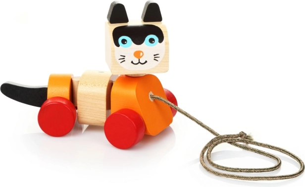 Drevená ťahacia hračka, navrhnutá v tvare veselého mačiatka, je ideálna pre zábavu a rozvoj motorických zručností detí. Hračka je vybavená pohyblivým telom a kolieskami, čo umožňuje plynulé a zábavné pohyby pri ťahaní za šnúrku. Farebný dizajn priláka pozornosť detí a povzbudí ich k aktívnej hre.