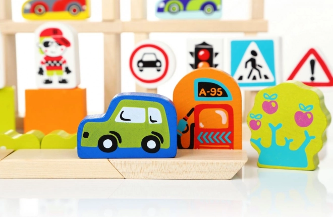 Dopravná stavebnica v meste zaujme deti vďaka svojej kombinácii farebných drevených kociek, ktoré môžu zložiť do podoby rušného mesta plného áut, semaforov a benzíniek. Vynikajúce pre rozvoj senzomotorických schopností, kreatívneho myslenia a logických zručností.