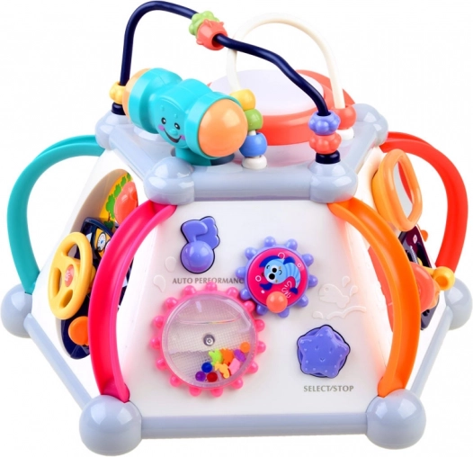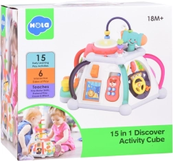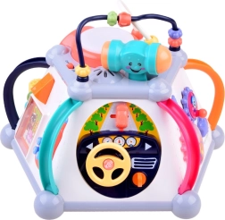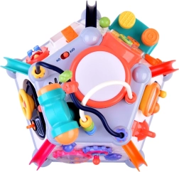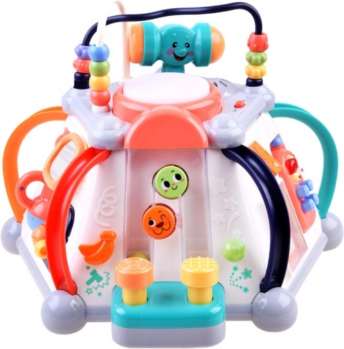 Multikocka HOLA prináša bohatú paletu aktivít pre najmenších. Každá stena ponúka iný typ hry – od riadenia autíčka cez ozubené kolá so svetlami a melódiami až po mikrofón s podsvieteným „televízorom“. Horná strana ukrýva labyrinty s korálikmi, svietiaci bubienok a miesto na uloženie kladivka. Všetko je navrhnuté pre malé detské ruky a bezpečné objavovanie.