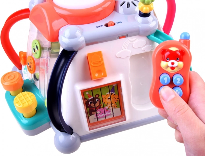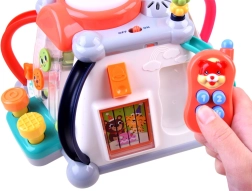- Stena s tlačidlami: vyberateľný „telefón“ s pískajúcimi tlačidlami; prepínanie obrázkov s rôznymi scénkami (narodeniny s HAPPY BIRTHDAY, čas spánku s uspávankou, ranná hygiena so zvukmi).