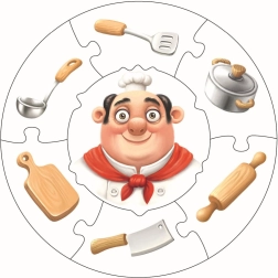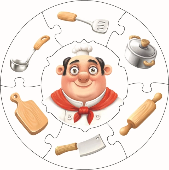 Ilustrácia kuchára s náradím (vareška, hrniec, valček) napomáha rozvoju logiky a spoznávaniu každodenných činností.