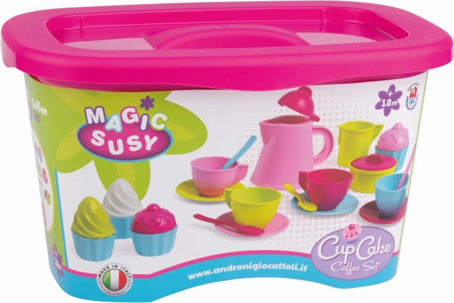 Štýlový kávový set od značky Androni premení každú detskú kuchynku na malú kaviareň. Sada obsahuje všetko na hru na baristu – od kanvičky a hrnčekov až po rozkošné cupcakes – a je vyrobená z kvalitných, pevných a pružných plastov v Taliansku. Vďaka 24 dielom, praktickému úložnému boxu s vekom a bezpečnému prevedeniu je ideálna pre deti od 18 mesiacov aj do materských škôlok.