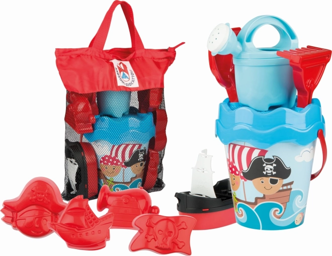 - Vedierko (Ø 17 cm), sitko, kanvička 0,5 l, lopatka, hrabličky, pirátska loďka, 4 formičky