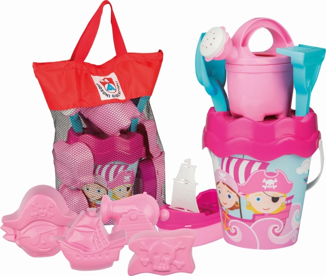 - Vedierko (Ø 17 cm), sitko, krhlička 0,5 l, lopatka, hrabličky, pirátska loďka, 4 formičky