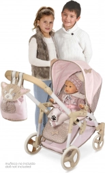 Okúzľujúci kočík pre bábiky v ružovo‑béžových tónoch prináša skvelú kombináciu dizajnu a funkčnosti. Vďaka polohovateľnému korbičkovému lôžku, ktoré ľahko premeníte na športové sedadlo, si deti užijú realistickejšiu hru. Súčasťou je aj prenosná taška pre bábiku s hebkou zamatovou výšivkou DIDI a praktickým štítkom proti ofúknutiu.