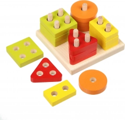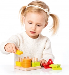 Farebné kruhy, štvorce, trojuholníky a obdĺžniky s otvormi sa nasadzujú na kolíky základne. Deti tak prirodzene triedia podľa tvaru aj farby a precvičujú logické myslenie.