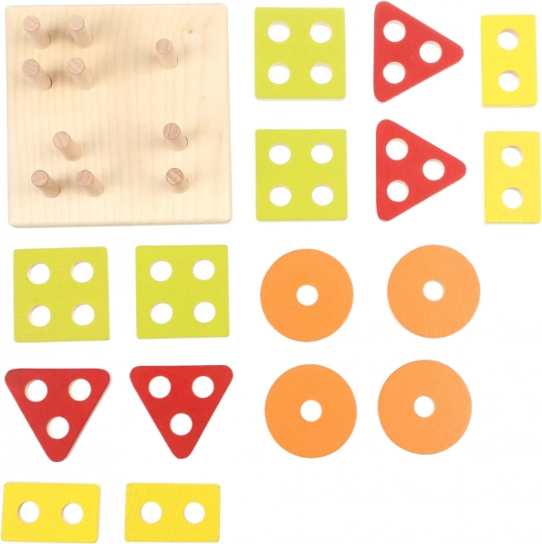 - Štvorcová drevená základňa s kolíkmi, 16 perforovaných geometrických tvarov v opakujúcich sa farbách