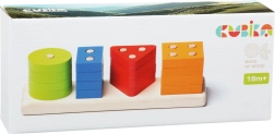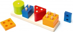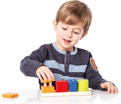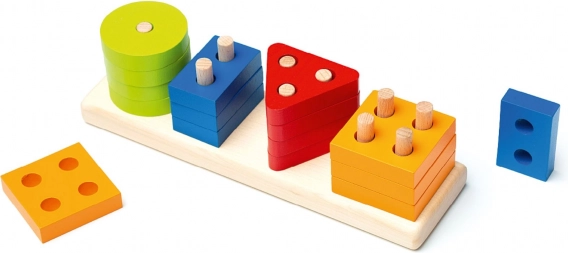 Táto kvalitná drevená skladačka ponúka 16 farebných geometrických tvarov, ktoré sa navliekajú na kolíčky na obdĺžnikovej základni. Deti sa pri hre učia rozpoznávať farby a tvary, skúšajú rôzne kombinácie a prirodzene trénujú koordináciu aj trpezlivosť.