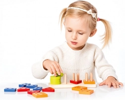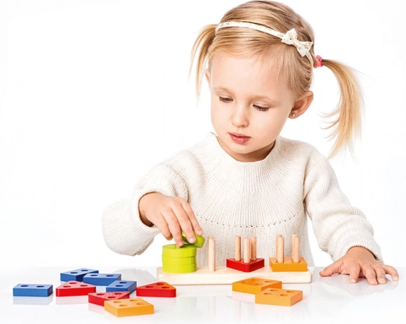 Navliekanie dielikov na kolíčky posilňuje koordináciu oko–ruka, presnosť úchopu a sústredenie – kľúčové zručnosti pre predškolský vek.