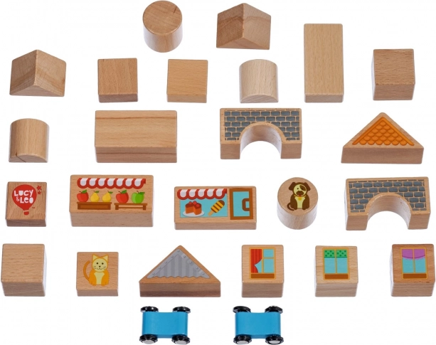 Postavte si vlastné malebné mestečko z precízne spracovaných drevených kociek a vyberte sa na výlet s dvomi malými autíčkami. Diely rôznych tvarov – kvádre, trojuholníky, valce aj mostíky – sa skvele kombinujú a motivujú deti ku kreatívnemu stavaniu aj k voľnej hre.