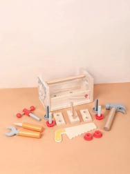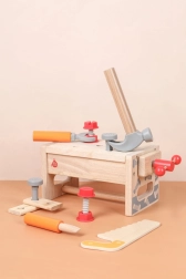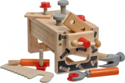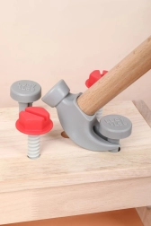 Súčasťou setu je rozmanité detské náradie: kladivo, pílka, skrutkovač, kľúč, skrutky a matice, zverák a hladké drevené dieliky s otvormi. Všetko má svoje miesto, takže sa deti učia poriadok aj základné techniky práce so spojovacím materiálom. Hra podporuje kreatívne stavebné hry, koordináciu oko–ruka a trpezlivosť.
