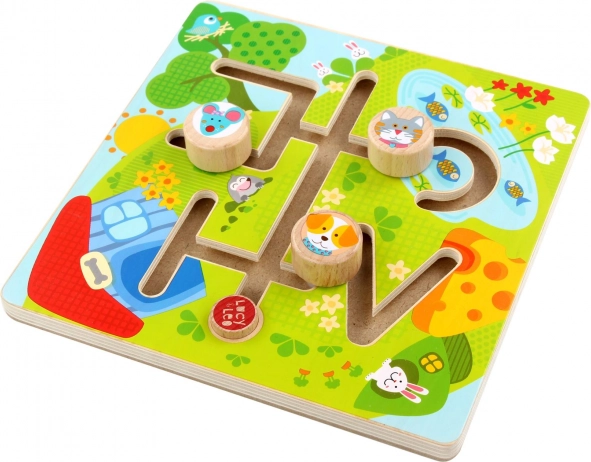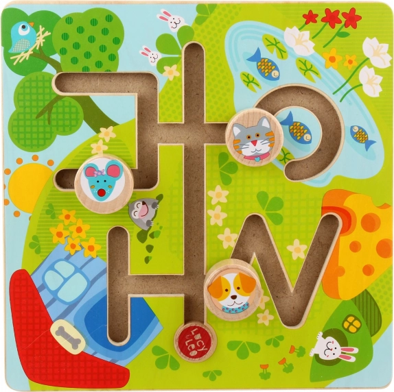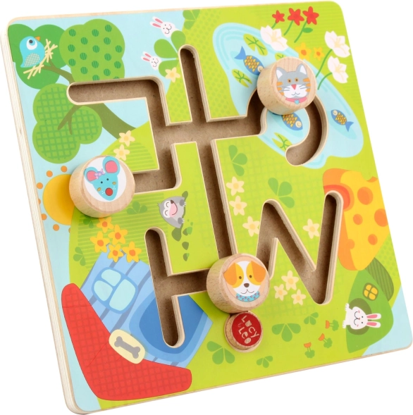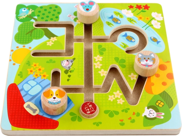Drevený labyrint Slnečné údolie prináša deťom radosť z objavovania aj učenia. Ilustrovaná hracia doska s jazierkom a zeleňou vtiahne deti do hry, kde pes, mačka a myška putujú k svojim cieľom. Vďaka plynulým drážkam sa figúrky ľahko posúvajú a hra je tak bezpečná a intuitívna.