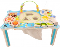 Uprostred stolíka je otvor s ľanovým vrecúškom na chytanie rybičiek magnetickým prútikom. Deti trénujú trpezlivosť a presnosť a zároveň majú dieliky vždy po ruke.