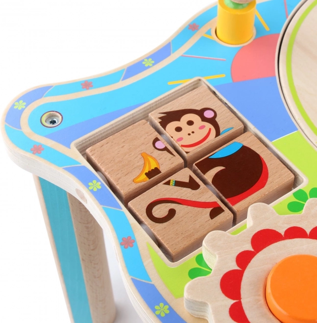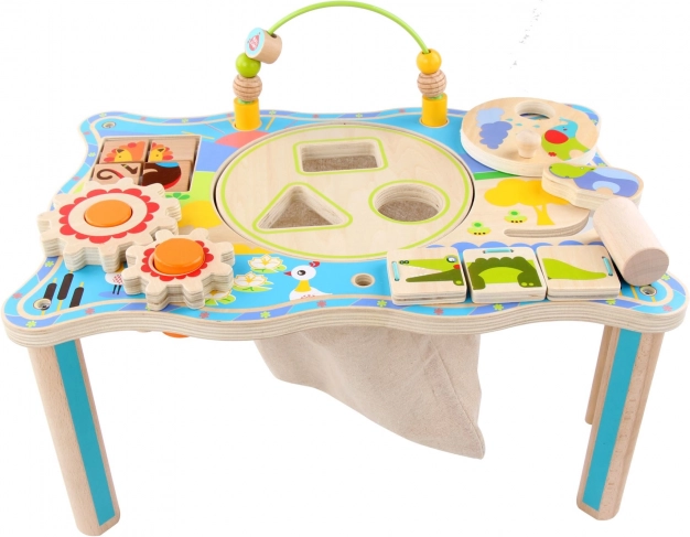 Drevený stolík s džungľovými motívmi prepája zábavu s učením a podporuje jemnú motoriku, koordináciu oko–ruka aj logické myslenie. Deti môžu otáčať ozubenými kolieskami, posúvať koráliky po dráhe, trénovať silu i sústredenie so zatláčadlom a precvičovať rozpoznávanie tvarov vďaka vkladacej hre. Uprostred je ľanové vrecúško na ulovené rybičky a herné dieliky, ktoré udržiava hernú plochu prehľadnú.