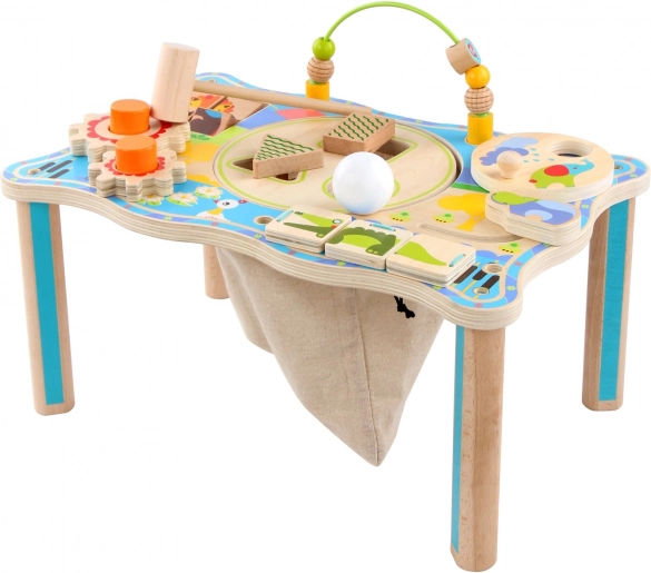 Objavte zábavu aj učenie v jednom s detským stolíkom LUCY & LEO – Expedícia v džungli. Tento kvalitný drevený multifunkčný stolík ponúka pestrú škálu aktivít na rozvoj detských zručností: magnetické chytanie rybičiek, ozubené kolieska, guľôčkové bludisko, zatláčadlo aj vkladacie tvary. Robustné prevedenie, hravý dizajn a praktické ľanové vrecúško na zber dielikov zaistia dlhé hodiny zmysluplnej hry.