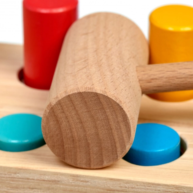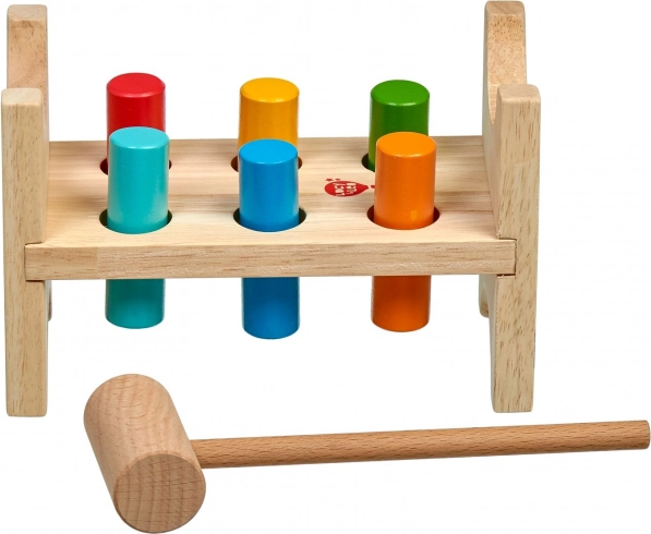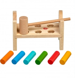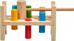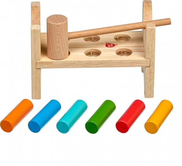 Šesť farebných kolíkov a drevené kladivko učia deti presnému úchopu, sile úderu a koordinácii oko–ruka.