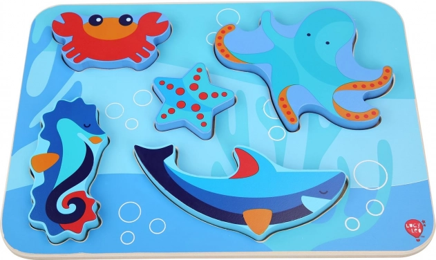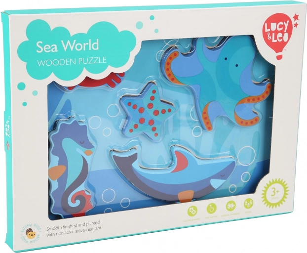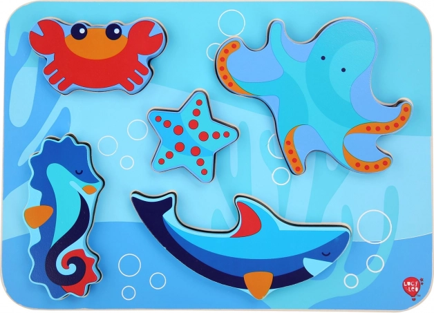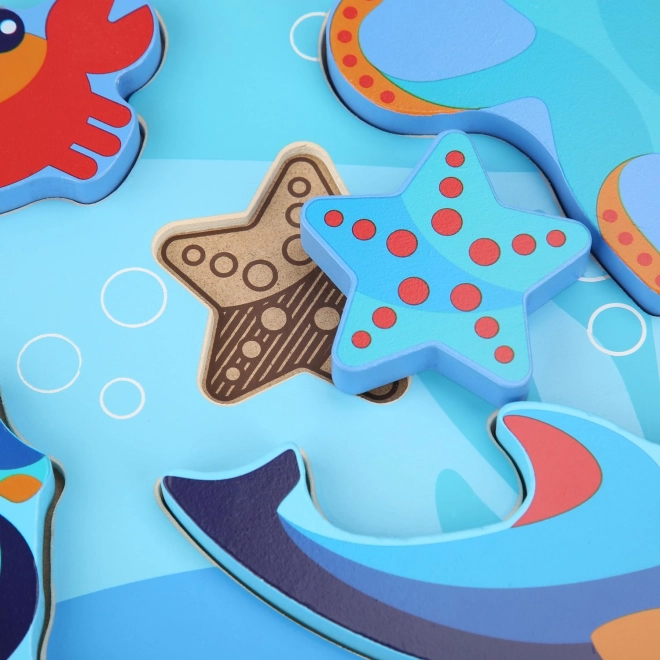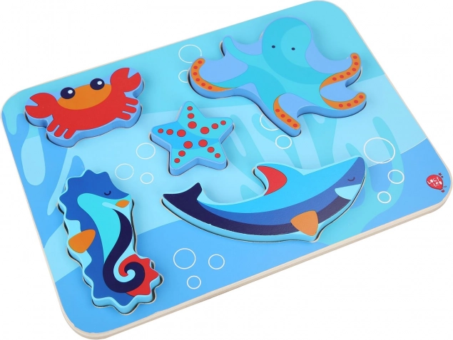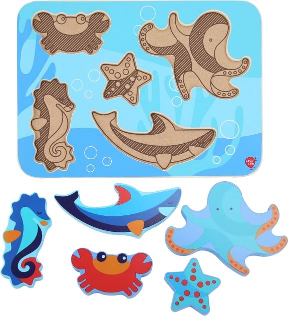 Detské drevené puzzle s motívom morských živočíchov je navrhnuté pre zábavné učenie. Šesť farebných dielikov – napríklad chobotnica, hviezdica či morský koník – presne zapadá do vyfrézovaných tvarov na pevnej podložke s oceánskym motívom. Dieliky sú dostatočne veľké, aby sa dobre držali a zároveň vďaka svojej hrúbke môžu samostatne stáť.