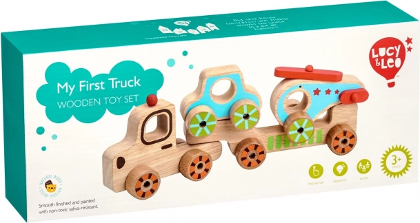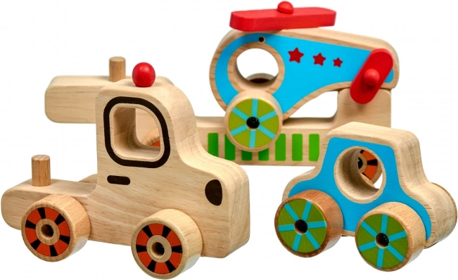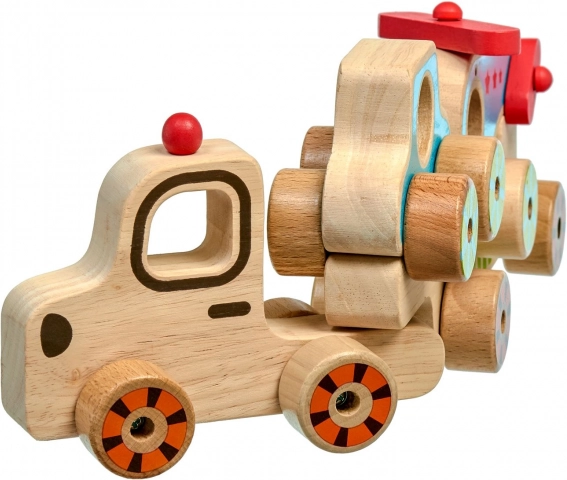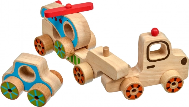Táto drevená skladačka pre najmenších spája zábavu s učením. Deti môžu samostatne jazdiť s kamiónom, autíčkom aj vrtuľníkom a potom ich všetky naložiť na korbu a vyraziť „na cestu“. Farebné akcenty a jednoduché tvary pomáhajú rozvíjať zrakové vnímanie, zatiaľ čo manipulácia s dielmi trénuje úchop a obratnosť.