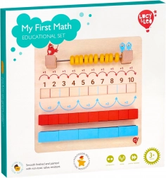 Drevená vzdelávacia sada pre prvé krôčiky v matematike od LUCY & LEO rozvíja logiku, počítanie a jemnú motoriku formou hry. Obsahuje hladkú drevenú dosku s počítadlom a drážkami pre kocky, 10 červených kociek a 5 modrých kvádrov na základy sčítania a odčítania. Bezpečné prevedenie a odolné materiály sú ideálne pre deti od 3 rokov.