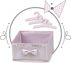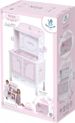 Objavte nežne ružovú kolekciu Niza s touto krásnou a praktickou skriňou pre bábiky, ktorá v sebe spája úložný priestor a prebaľovacie centrum. Spodná časť ponúka šatníkovú tyč a zásuvku na uloženie oblečkov, horný nástavec slúži ako prebaľovací pult s potlačou v dizajne kolekcie.