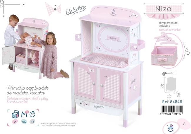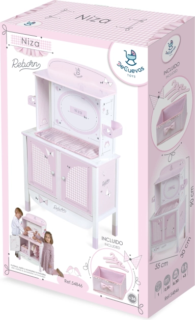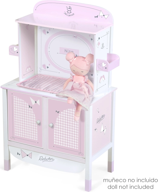 Vďaka precíznemu španielskemu dizajnu a starostlivo vybraným materiálom pôsobí skriňa ľahko a čisto. Praktické rozmery zaisťujú stabilitu aj dostatok miesta pre všetky nevyhnutnosti k starostlivosti o bábiku až do dĺžky 45 cm.