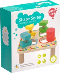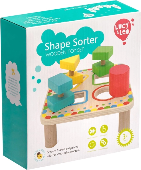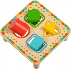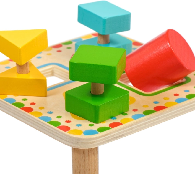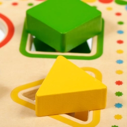 Doska na stabilných nožičkách má štyri farebne orámované otvory, ktoré ladia s farbami jednotlivých dielikov. Sada je ideálna na samostatnú hru aj spoločné objavovanie s rodičmi a skvele sa hodí ako kvalitná drevená edukatívna hračka pre predškolákov.